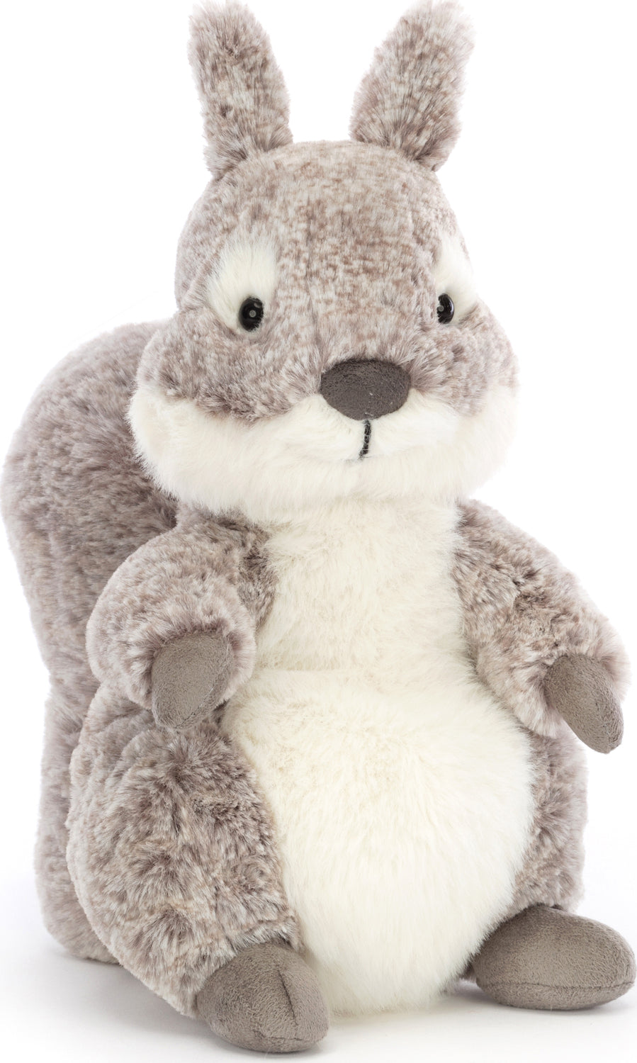 Pebble-grey with scrumbly speckles, Ambrosie Squirrel is simply adorable. Leaning back on a big squishy tail, this cheeky chum has such a fuzzy tum! With suedey grey paws for gathering nuts, tussly brows and a bobble nose, this roundy rascal is so scruffable. Time to scramble!